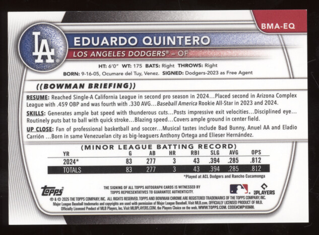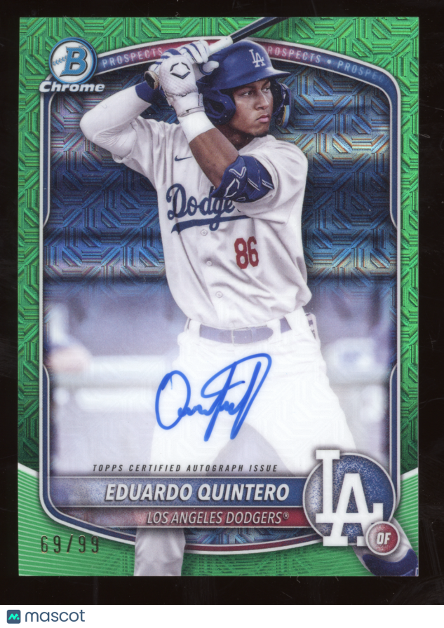 You are purchasing a 2025 Bowman Chrome Prospects Autograph Eduardo Quintero #BMA-EQ Green Mega Refractor 69/99. You will receive the exact item in the photographs. Thank you for looking.