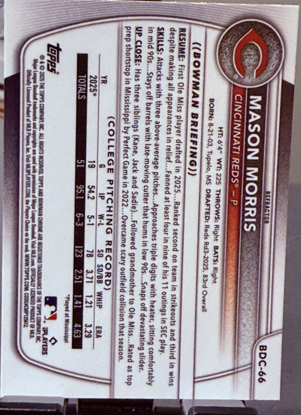 2025 Bowman Draft Chrome Mason Morris #BDC-66 1st Bowman Silver Refractor (RC)