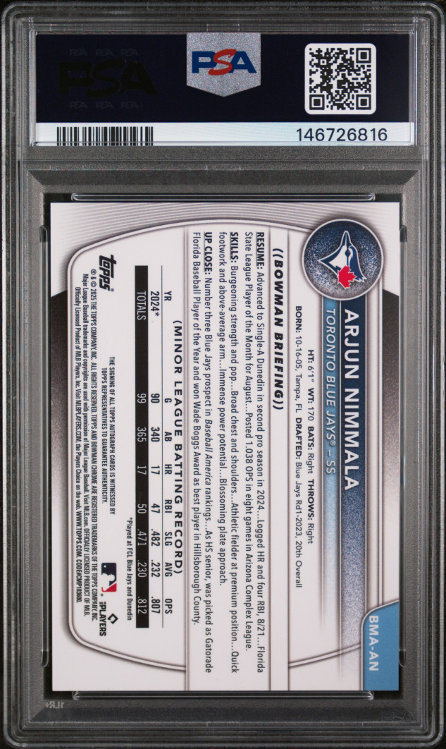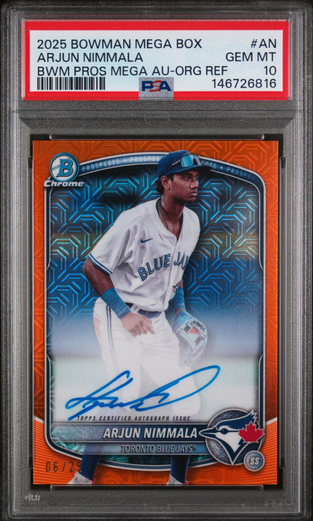2025 BOWMAN MEGA BOX ARJUN NIMMALA BOWMAN PROSPECT AUTOGRAPH ORANGE REFRACTOR /25. PSA 10. ON ITS WAY BACK FROM PSA!!
