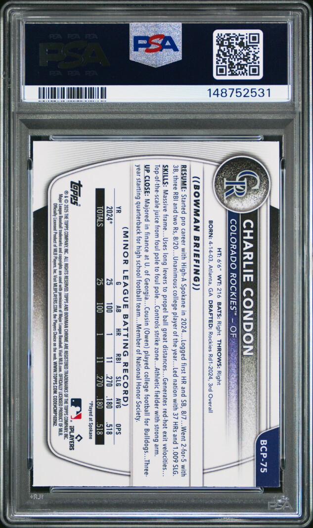 You are purchasing a 2025 Bowman Mega Box Chrome Prospects Charlie Condon #75 PSA 9. Thank you for looking.