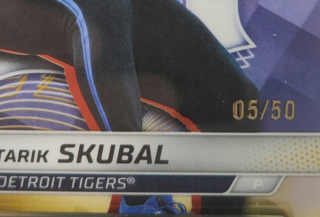 This is a serial-numbered Gold Refractor (#05/50) featuring one of the most dominant left-handed pitchers in MLB today, Tarik Skubal.