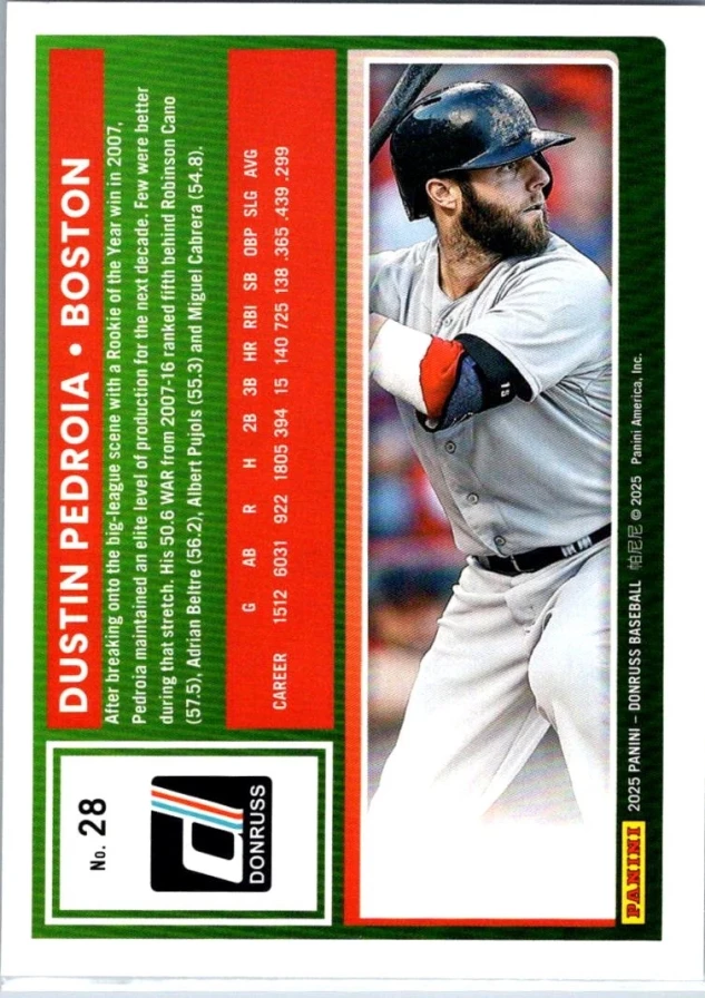 This is a nice example of a 2025 Donruss #28 Dustin Pedroia