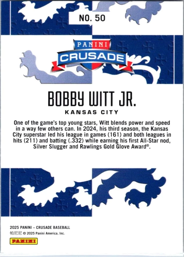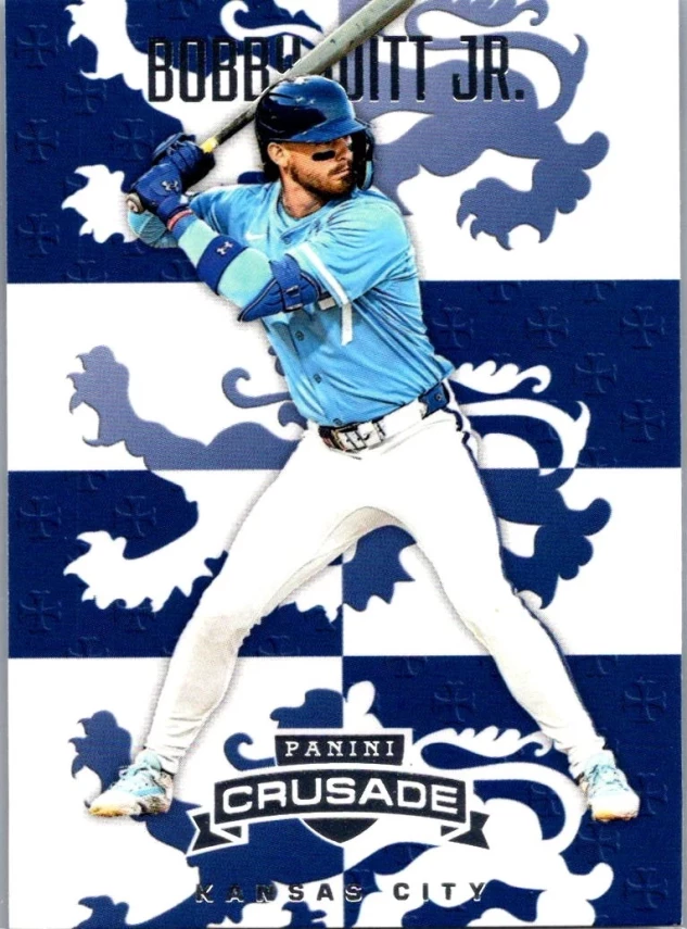 This is a nice example of a 2025 Panini Crusade #50 Bobby Witt Jr.