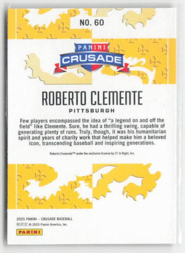 You are purchasing a 2025 Panini Crusade Roberto Clemente #60. You will receive the exact item in the photographs. Thank you for looking.