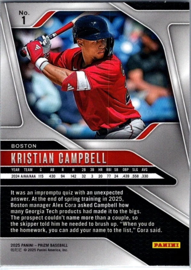 This is a nice example of a 2025 Panini Prizm #1 Kristian Campbell