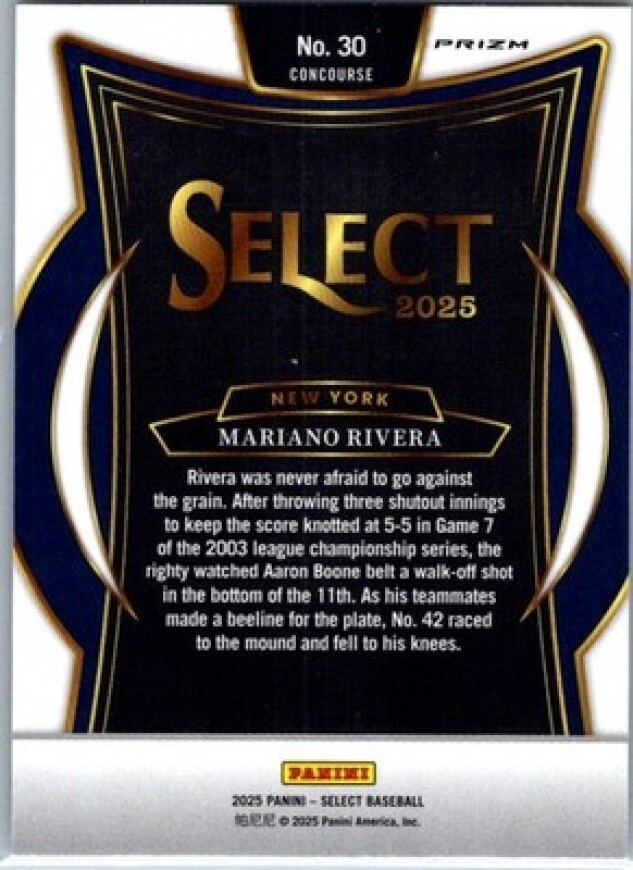 This is a nice example of a 2025 Panini Select #30 Mariano Rivera Silver Prizms