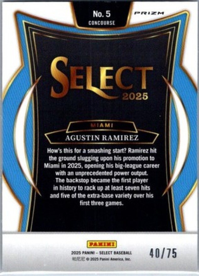 This is a nice example of a 2025 Panini Select #5 Agustin Ramirez Purple Prizms