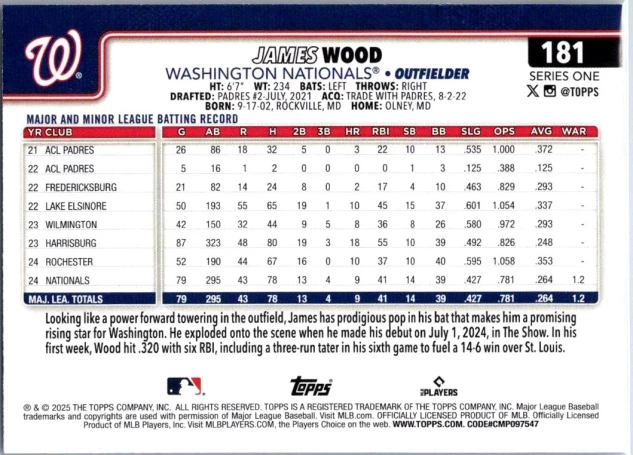 This is a nice example of a 2025 Topps #181 James Wood