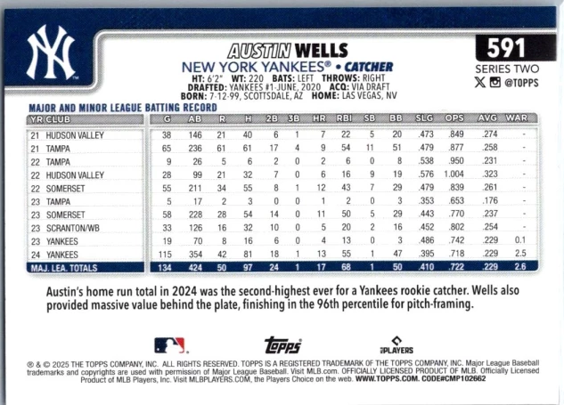 This is a nice example of a 2025 Topps #591 Austin Wells Holo Foil