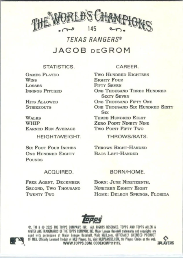 This is a nice example of a 2025 Topps Allen & Ginter #145 Jacob deGrom