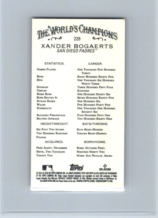 This is a nice example of a 2025 Topps Allen & Ginter #229 Xander Bogaerts Mini Gold Border
