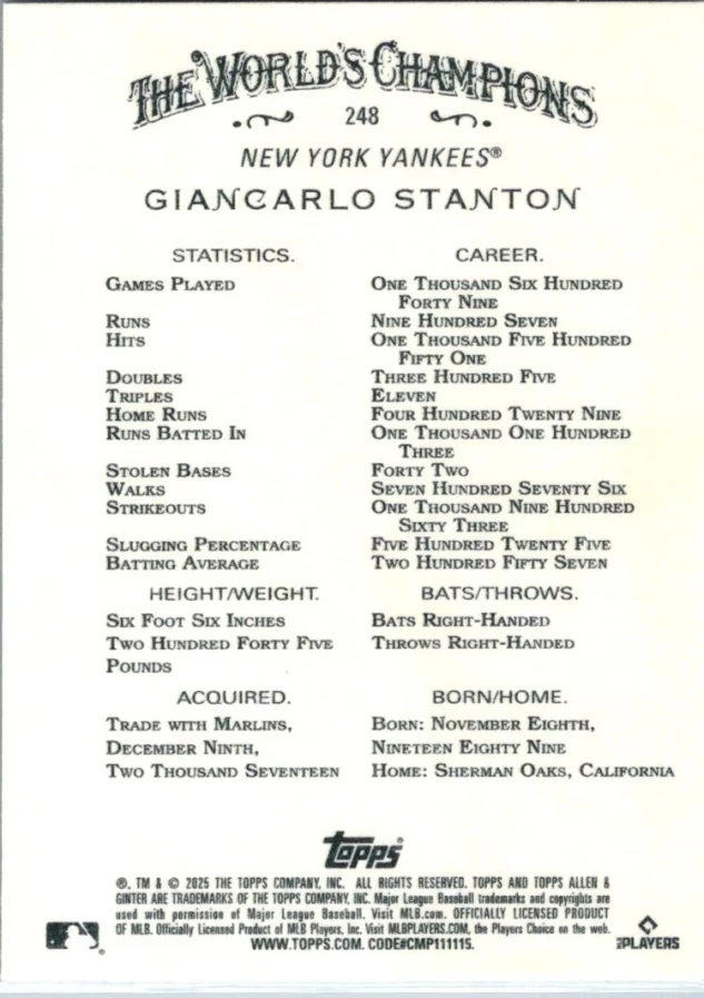This is a nice example of a 2025 Topps Allen & Ginter #248 Giancarlo Stanton