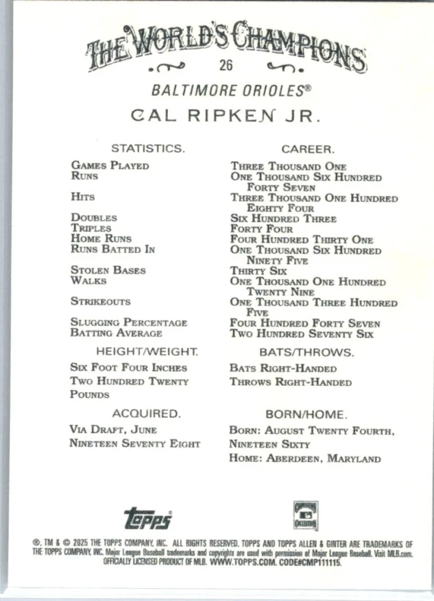 This is a nice example of a 2025 Topps Allen & Ginter #26 Cal Ripken Jr.