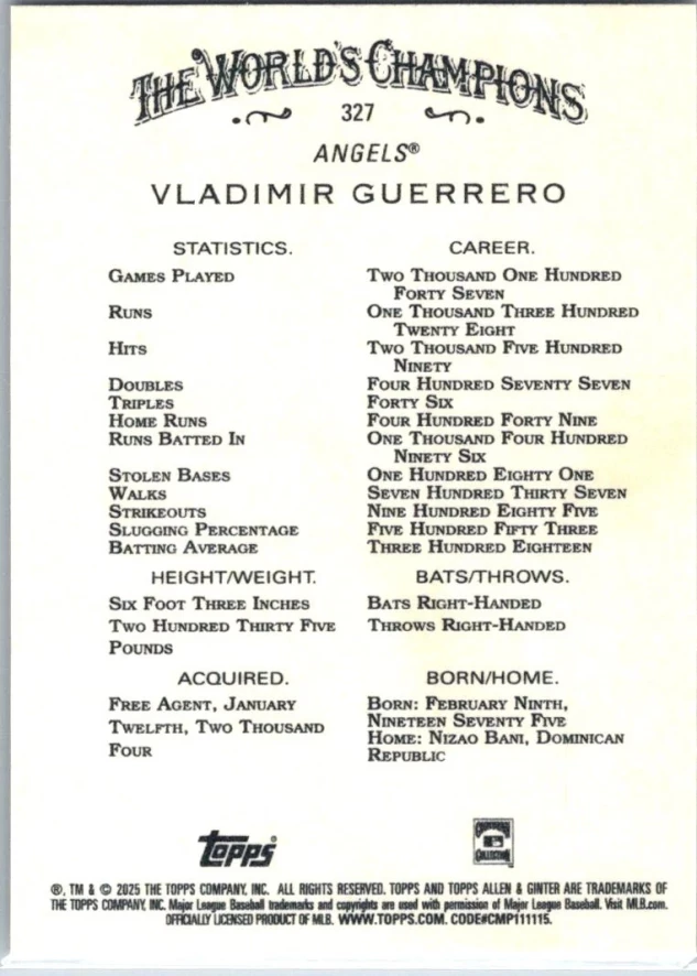 This is a nice example of a 2025 Topps Allen & Ginter #327 Vladimir Guerrero