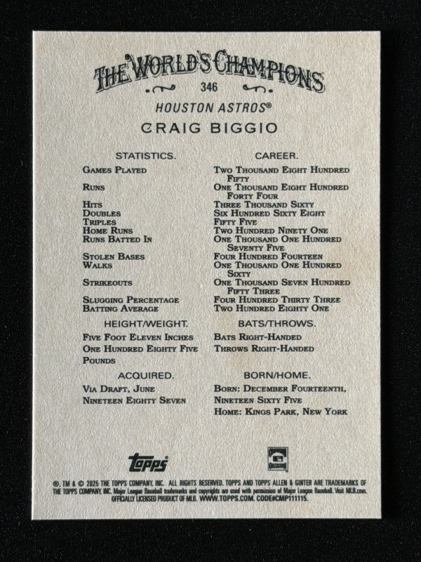 You are purchasing a 2025 Topps Allen & Ginter High Number Craig Biggio #346 SP Short Print .