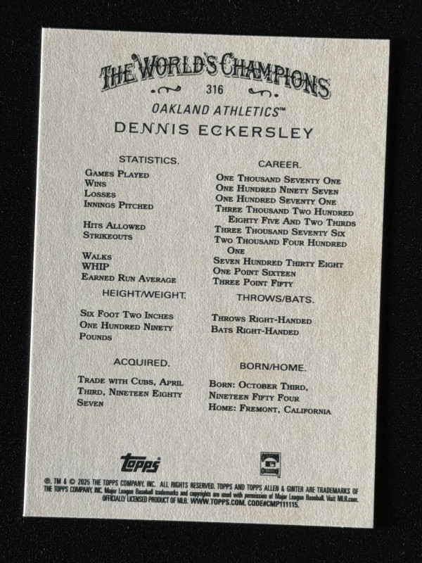 You are purchasing a 2025 Topps Allen & Ginter High Number Dennis Eckersley #316 SP Short Print .