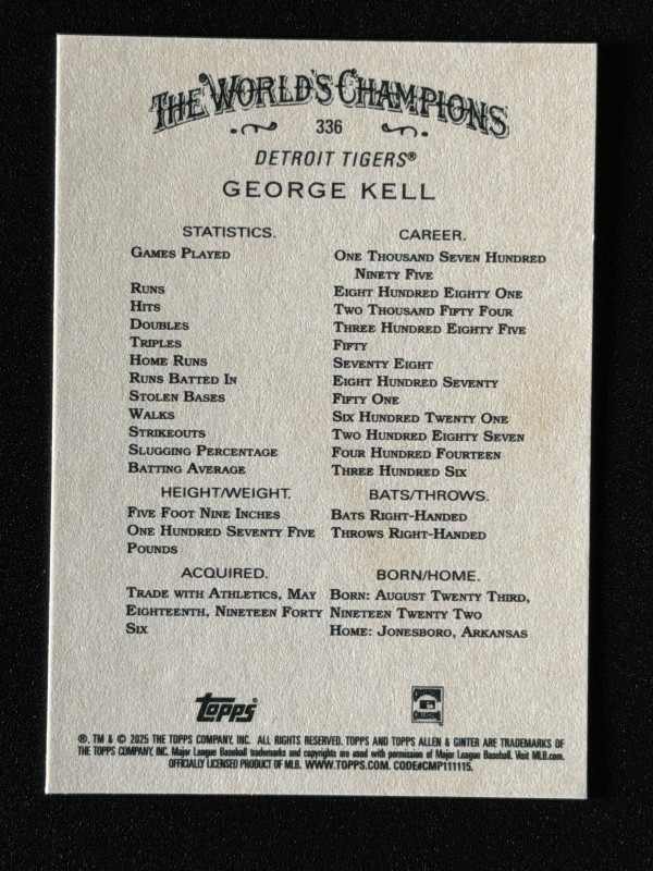 You are purchasing a 2025 Topps Allen & Ginter High Number George Kell #336 SP Short Print .
