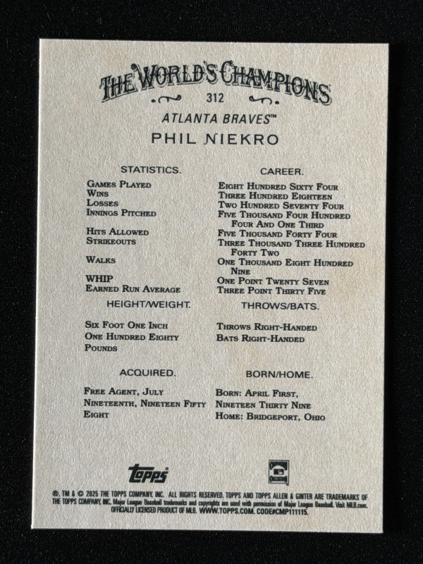 You are purchasing a 2025 Topps Allen & Ginter High Number Phil Niekro #312 SP Short Print .