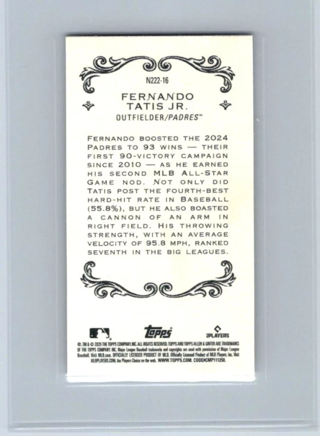 This is a nice example of a 2025 Topps Allen & Ginter #N222-16 Fernando Tatis Jr. Mini 1889 N222