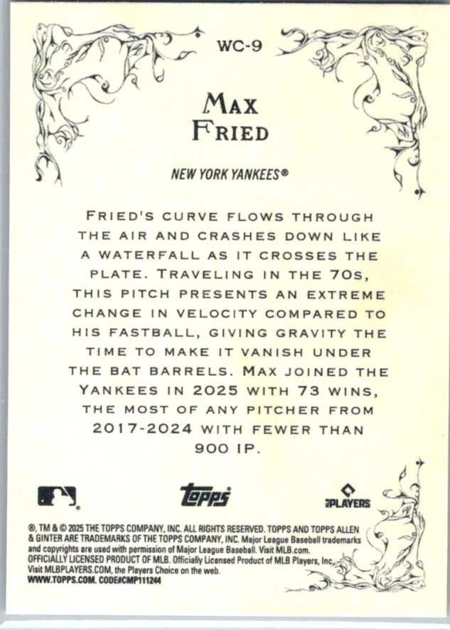 This is a nice example of a 2025 Topps Allen & Ginter #WC-9 Max Fried Wicked Curves