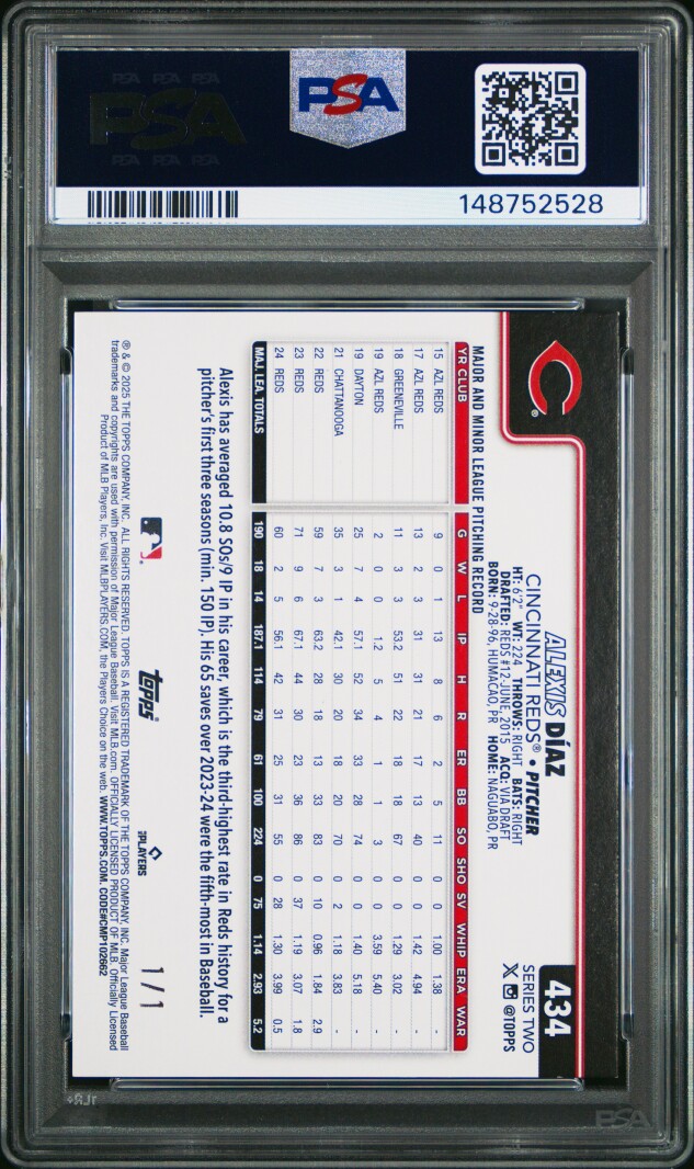You are purchasing a 2025 Topps Alexis Diaz #434 Foilfractor 1/1 PSA 9. Thank you for looking.