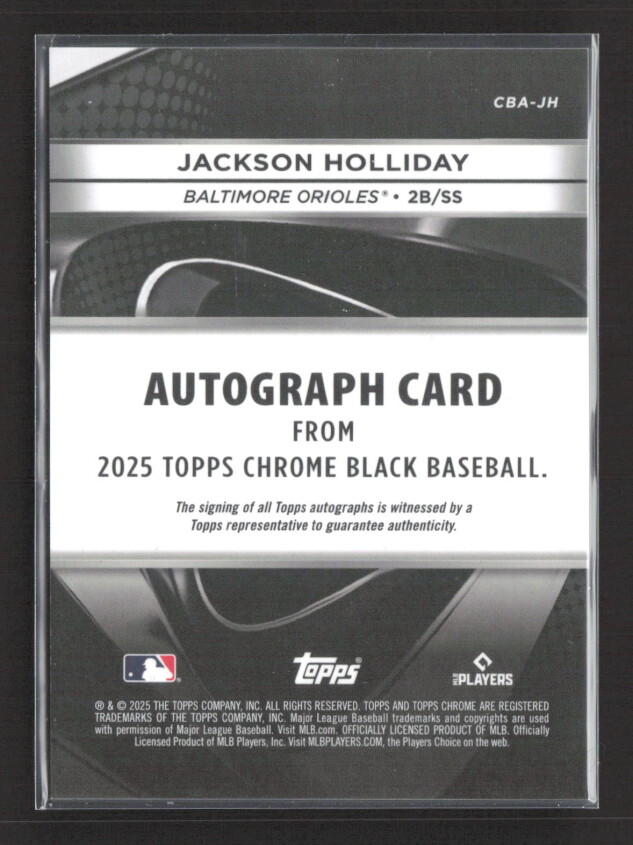 You are purchasing a 2025 Topps Chrome Black Jackson Holliday #CBA-JH. You will receive the exact item in the photographs. Thank you for looking.