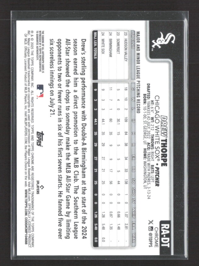 You are purchasing a 2025 Topps Chrome Drew Thorpe #RA-DT Red Refractor 08/25 RC. You will receive the exact item in the photographs. Thank you for looking.