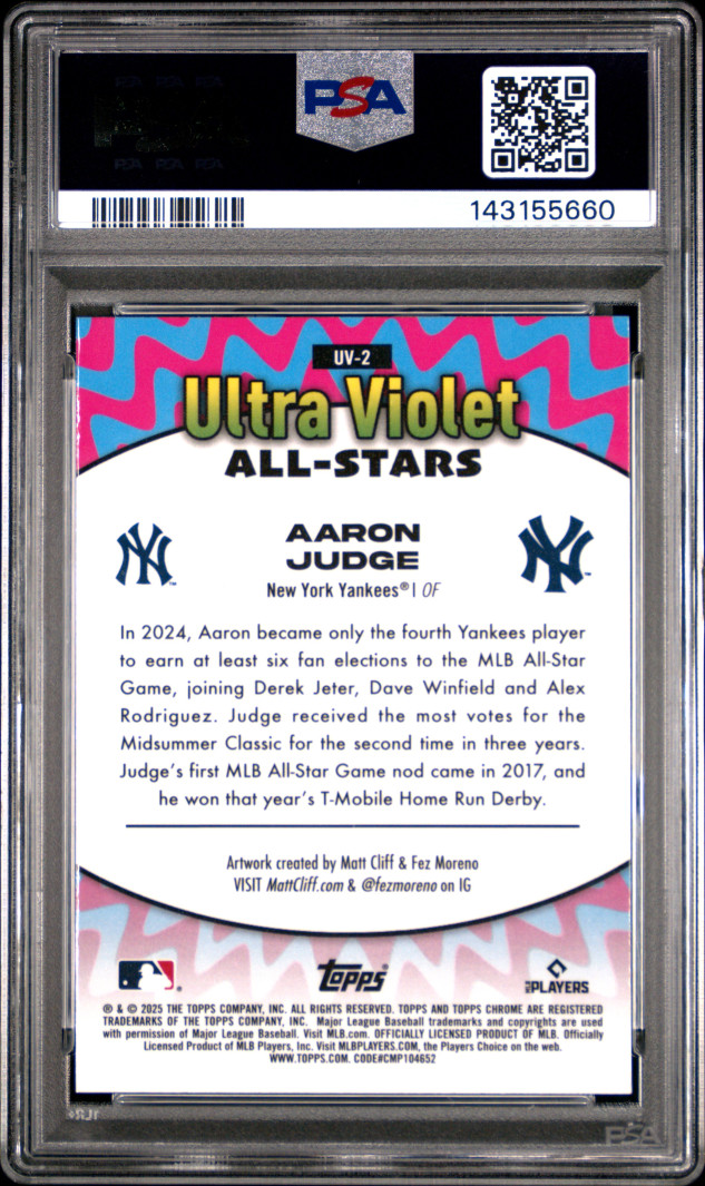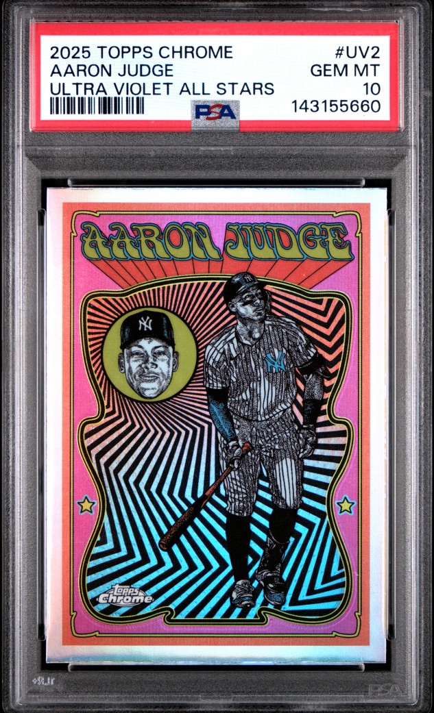 The product is a 2025 Topps Chrome Ultra Violet All-Stars Aaron Judge #UV-2 trading card graded as PSA 10 GEM MINT. This card features Aaron Judge from the New York Yankees and is part of the MLB World Series event/tournament. It is a Chrome parallel/variety card made of card stock with a thickness of 35 Pt., signed by Jordan Lawlar with Topps authentication. This collectible item is an insert in the Topps Chrome set for the 2025 season in Major League Baseball.