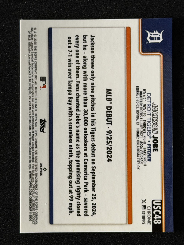 You are purchasing a 2025 Topps Chrome Update Series Jackson Jobe #USC48 RayWave Refractor RC .