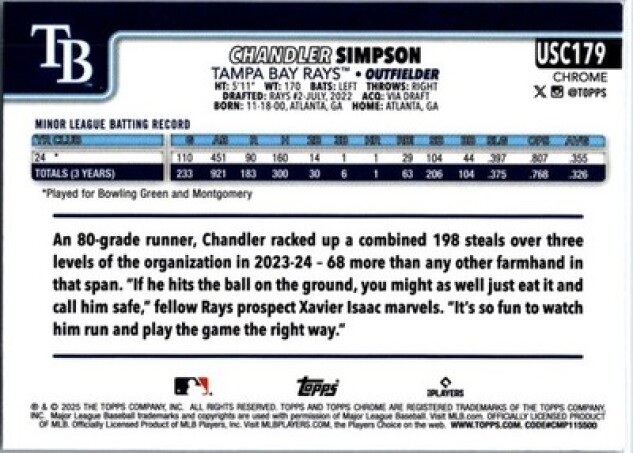 This is a nice example of a 2025 Topps Chrome Update #USC179 Chandler Simpson