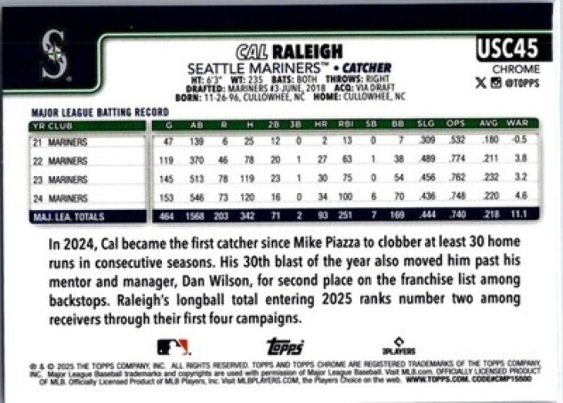 This is a nice example of a 2025 Topps Chrome Update #USC45b Cal Raleigh