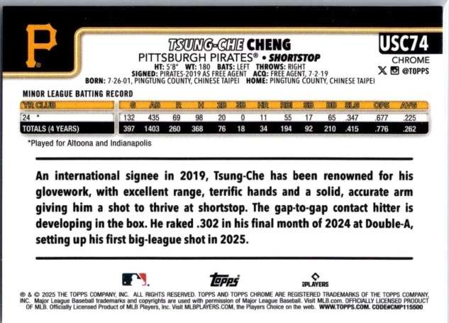 In 2025 Tsung-Che Cheng played for the Pittsburgh Pirates.