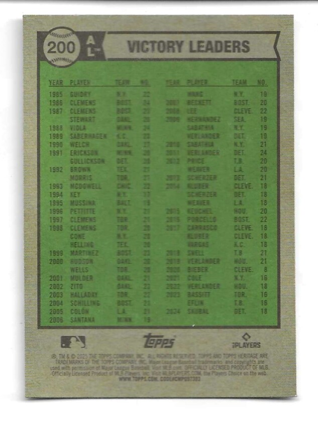 2025 TOPPS HERITAGE CHROME SILVER SPARKLE REFRACTORS LEAGUE LEADERS #200 TARIK SKUBAL, JOSE BERRIOS & SETH LUGO (AL VICTORY LEADERS)