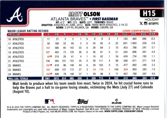 This is a nice example of a 2025 Topps Holiday #H15 Matt Olson Silver Glitter Holiday