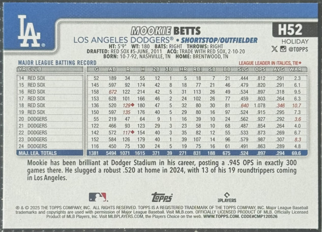 2025 Topps Holiday Mookie Betts #H52 - LA Dodgers
