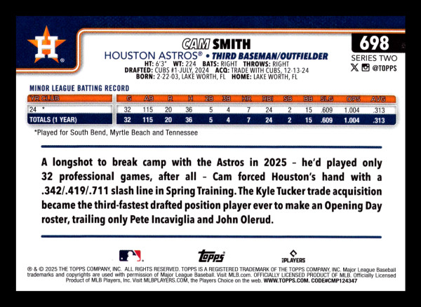 You are purchasing a 2025 Topps Series Two Cam Smith #698 Image Variations RC. You will receive the exact item in the photograph/scan. Thank you for looking.