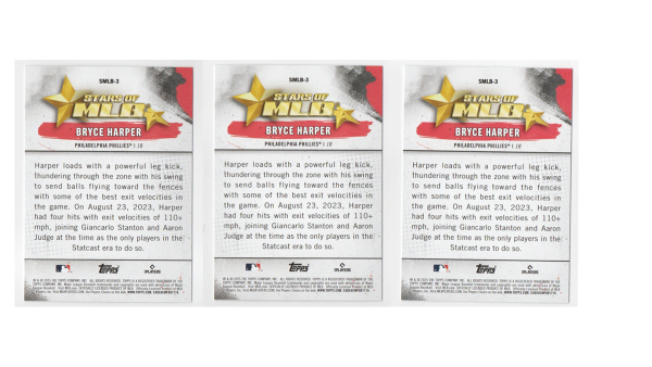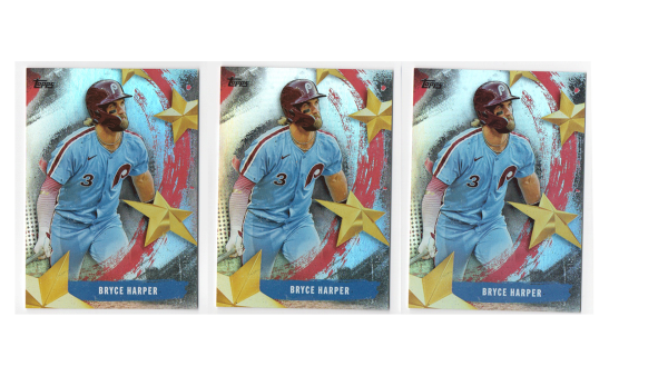 Lot of (3) 2025 Topps Stars of MLB Bryce Harper. This lot is great for building singles or your own lots for Whatnot, online sales, or shows! All orders $100+ receive free shipping. Thanks for visiting Normans All-Stars MCP shop!