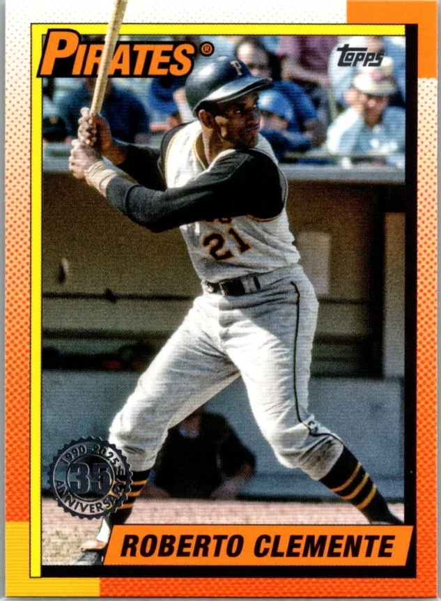 This is a nice example of a 2025 Topps #T90-27 Roberto Clemente 1990 Topps Baseball 35th Anniversary (Series One)