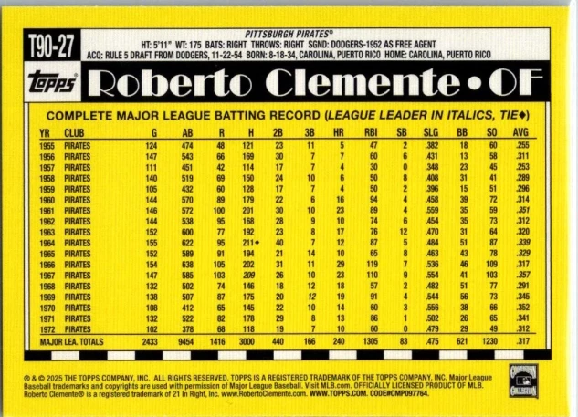 2025 Topps #T90-27 Roberto Clemente 1990 Topps Baseball 35th Anniversary