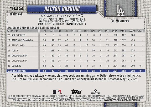You are purchasing a 2026 Topps Dalton Rushing #103. You will receive the exact item in the photographs. Thank you for looking.
