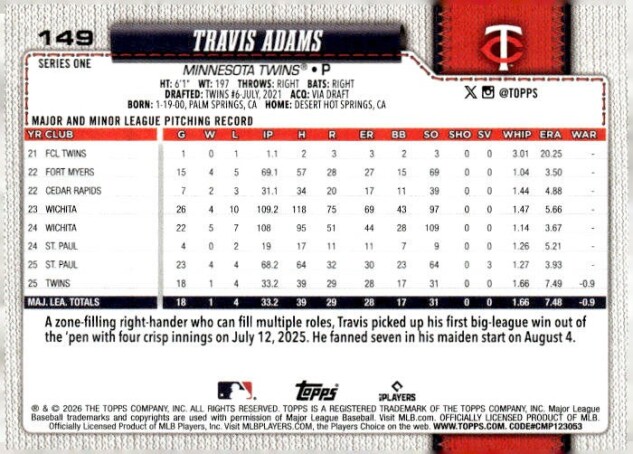 You are purchasing a 2026 Topps Travis Adams #149 RC. You will receive the exact item in the photographs. Thank you for looking.