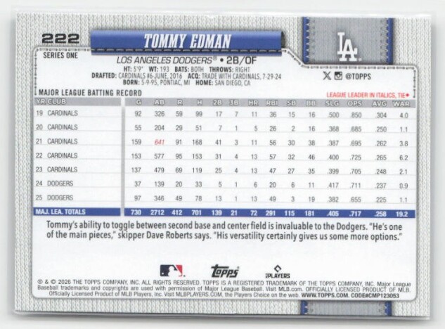 You are purchasing a 2026 Topps Tommy Edman #222 Rainbow Foil. You will receive the exact item in the photographs. Thank you for looking.