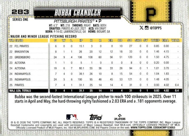 You are purchasing a 2026 Topps Bubba Chandler #283 RC. You will receive the exact item in the photographs. Thank you for looking.