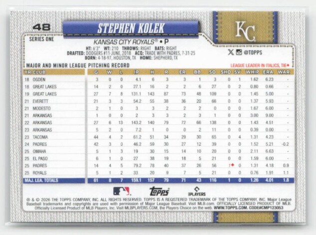 2026 Topps #48 Stephen Kolek Sandglitter Refractor