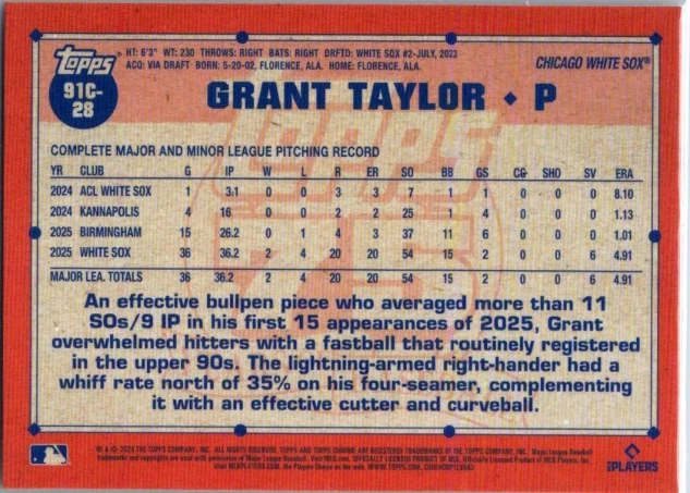 This is a nice example of a 2026 Topps #91C-28 Grant Taylor 1991 Topps Baseball 35th Anniversary Chrome (Series One)