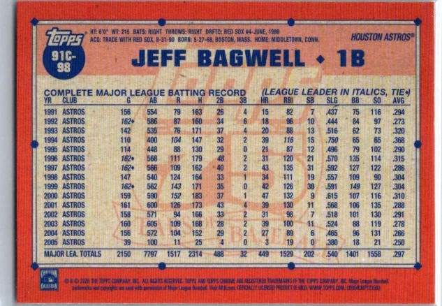This is a nice example of a 2026 Topps #91C-98 Jeff Bagwell 1991 Topps Baseball 35th Anniversary Chrome (Series One)
