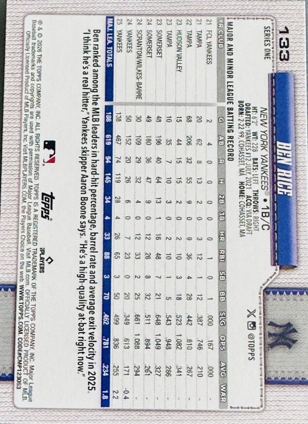 2026 Topps Series 1 Ben Rice Rookie Card (#139) – New York Yankees.