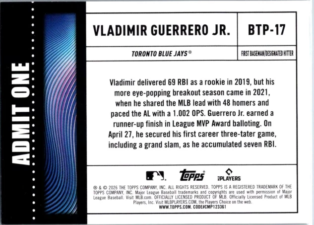 This is a nice example of a 2026 Topps #BTP-17 Vladimir Guerrero Jr. Big Ticket Players