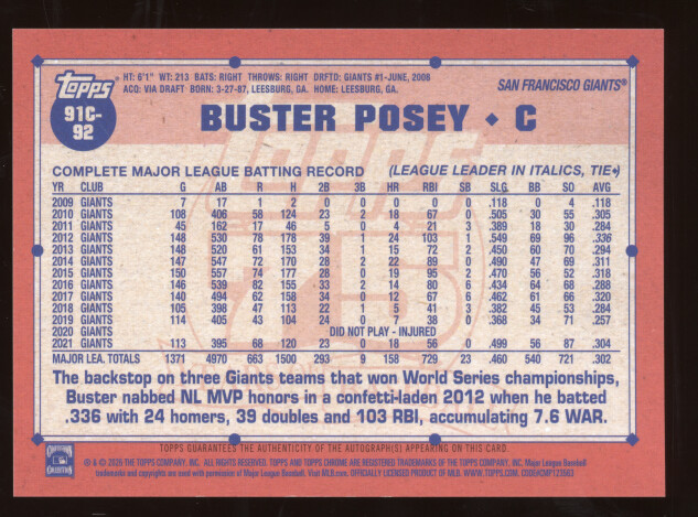 You are purchasing a 2026 Topps Chrome Buster Posey #91C-92 1991 Gold Autograph 06/50. You will receive the exact item in the photographs. Thank you for looking.