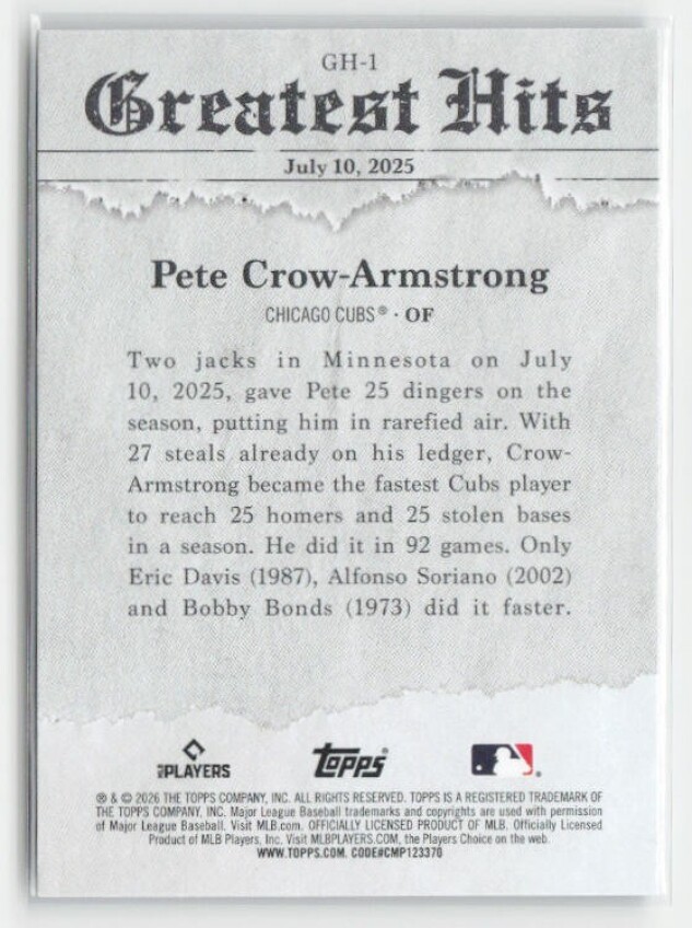 You are purchasing a 2026 Topps Pete Crow-Armstrong #GH-1 2025 Greatest Hits. You will receive the exact item in the photographs. Thank you for looking.